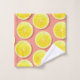 A pattern of fresh & juicy lemon slices in bright, vivid shades of yellow, with a watercolour texture to give it that freshly cut look. They are placed on a salmon pink background for a bright & summery look, like pink lemonade.
