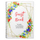 This fun and whimsical birthday party guest book features watercolor blueberries, strawberries, redberries and foliage on a gold geometric frame. The text combines handwritten script and serif fonts for a stylish and modern look. This is perfect for a summer rustic birthday party.