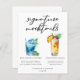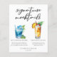 This chic signature mocktails menu sheet features simple black typography above 2 cute drinks and their ingredients for your summer wedding bar. A Blue Hawaiian Sunrise drink and non-alcoholic virgin Piña Colada add a cool flair to your bar menu. Complete with the couple's names and date for their reception.