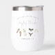Get the party started with these cute bachelorette party wine tumblers that are easy to personalise for your bachelorette party, hen night, or girls' weekend! Boho wine country style design features delicate watercolor illustrations of sandals, champagne glasses, a mixed cocktail and a chic black swimsuit with charcoal grey accent lettering. Personalise with three lines of custom text; shown with the bride's name, event type, location and individual name.