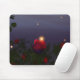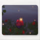In the dusk of a summer night fireflies float and glow over a rose garden filled with vibrant red roses.
