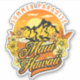Grunge retro style illustration with "Summer Paradise, Maui Hawaii" text design and waves, mountains, sun, sunset and tropical flowers decoration in yellow and orange