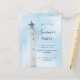 An invitation for a nautical coastal by the sea summer party, beach party. A light blue sky as background and a white lighthouse as decoration. Templates for your party details, information.