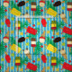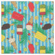 Bold summer patterned fabric printed with hand drawn ice creams, lollies, popsicles and fruit slices over tropical palm leaves blue stripes