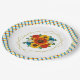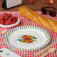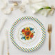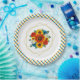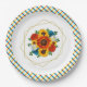 Summer party paper plates with a sunflower floral theme, geometric frame and colourful red, yellow and blue border