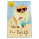 It’s a dog’s life! Be cool and celebrate the dog days of summer with this cute Pomeranian wearing sunglasses and relaxing with a drink.