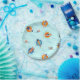 Cute ice blue color theme of a pool party with funky illustration design of pool toys and people having fun in a large aquamarine pool. Perfect for a Summer vacation holiday vibe.
