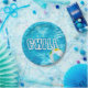 "chill" text in wavy font effect for swimming pool party with splashing beach ball in turquoise pool water.
