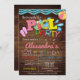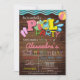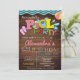 A Pool Party Invitation for Girls. Pool party invitation on a wooden background with colourful summer pool elements, blue water waves and beach ball. Perfect for a Birthday Party outside with closest friends.