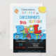 Printable Summer Pool Party Invitation for Boys. Set on a blue background with colourful summer pool elements, blue water waves and beach ball. Perfect for a Birthday Party outside with closest friends.