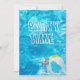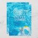 Swimming pool party invite with cocktail and beach ball splash in turquoise water.