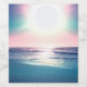 Beautiful tropical beach seascape colourful sunset sea view photo, featuring an amazing iridescent rainbow colours sunset over the sea, blue ocean calm waves, shining bluish beach sand and a big bright glowing white sun, projecting a blend of pink, teal, blue, green yellow pastel colours horizon coast. This unique tropical paradise sea original nature picture brings to any decor a sense of a calm, relaxed summer holiday.