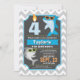 Blue shark summer beach theme birthday party invitation for boy or girl. Invite features grey and white chevron pattern, sharks wearing sunglasses, and blue back. 4th birthday candle can be personalised.