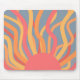 This mouse pad has a nature design of a sunrise made of curvy lines in red, yellow, and orange, a sun, and the sky.