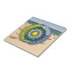 This beach themed mandala features layers of seashells, sailboats, sand, sun, sea, and palm trees inside of a transparent beach ball to bring to mind the fun that comes with summer. This tile can be framed to create a trivet or placed inside a wooden gift box. Tiles without a frame will also fit inside the large gift box to create a matching set.