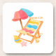 A colorful summer design featuring a lounge chair, a striped parasol, a straw hat, a starfish, and a basket of flowers. A soft and cheerful watercolor style, perfect for celebrating the joys of summer.