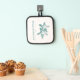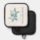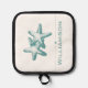 This potholder features a summery design of overlapping starfish above a separator line with a starburst detail, and a personalised name below, all in teal on white.