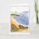 This fun watercolor is of a beach scene with its row boat and lighthouse in the background with sailboats sailing the blue sea.