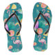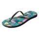 Lots of fun tropical summer images make a colourful pattern on these cute flip flops. Images include a pink flamingo, an ice cream cone, ice cream bars, a bright grapefruit slice, and a lemon, all surrounded by gold stars and green palm leaves. The multi coloured, bright images are placed on a dark teal background. Bright, colourful and fun, no matter where you spend the summer!