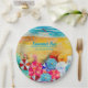 Waves on a sandy beach, a surfer and sunbathers under colourful umbrellas, these personalised paper plates are a fun addition to your summer decor, family reunion, vacation or any occasion.