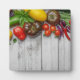 Top border of fresh, organically homegrown vegetables and herbs - including tomatoes, squash,cucumbers, beans, hot peppers and basil - on a rustic white washed wooden background