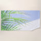 Stylish Pale Green Palm Tree Leaves Blue Sky White Building Background Summer Vibes Beach Towel to add to your collection. A cool gift / present idea for all who love custom design personalised items, positive summer vibes, minimalism, clean lines, nature, plants, beach, holidays, organic theme, yoga, meditation etc. Add your details, customise.