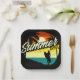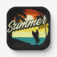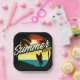 Retro style design features "summer vibes" text with tropical sunset and female surfer silhouette graphics