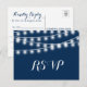 Modern Summer Wedding RSVP String Lights Design in blue with simple yet elegant glowing white string lights hanging across the top with a stylish mix of modern typography on a summer night dark blue background. A simple and trendy, preppy design, perfect for summer! Click the "CUSTOMIZE IT" button to customise names,address, text,fonts, move text around,change the background colour and create your own unique one-of-a-kind RSVP card design.