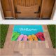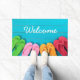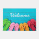 Door mat shown with a cute photo print of summer beach time flip flops welcoming you.