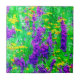 Ceramic tile in a pastel chalk sketch pattern of scattered, summer wildflowers, in a field of green meadow grasses
