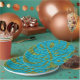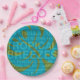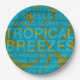 Words that mean summer: Tropical Breezes, Cool Blue and Tequila Sunrise combined with images of Monstera Leaves, Palm Trees, Hibiscus and create this graphic design. The paper napkins coordinate with the paper plates in the reversed colour positions.