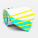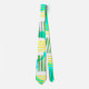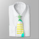 This tie has a mid-century modern design that looks like a weave with yellow and green lines on a field of light blue with clouds.