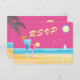 This colourful pink, summer wedding RSVP is accented with a bright sun, seagulls, blue water, and a couple of tropical drinks. The type gives this RSVP a retro feel, and keeps it fun and playful, making it perfect for the beach, Caribbean, Hawaiian, seaside, tropical or summer wedding.