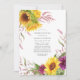 Rustic boho sunflowers and dahlias Celebration of Life invitation in hues of burgundy and sun colours.