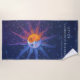 This unique beach towel features an artistic rendition of the moon and sun coming together with a blue star filled night sky.  The text reads "There's Nothing Like Perfect Alignment" with the date "8.21.17" below.  The date refers to the Great American Solar Eclipse occurring on August 21, 2017.  Text and date may be personalised to represent a "Perfect Alignment" in your own life.
