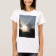 A photograph of a beautiful sun burst peeking out from behind a white cloud against a blue sky about some trees on a shirt