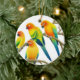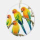 Original fine art design of colourful Sun Conure parrots by illustrator/designer Carolyn McFann of Two Purring Cats Studio on a quality holiday ornament for bird lovers.