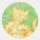 A happy, yellow tabby cat rolling around on the grass in the sunshine. Sticker with a yellow, orange, green, white and blue customisable design for you to personalise with your own text, pictures and ideas. An original coloured pencil drawing by Jess Perry.