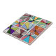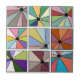 This ceramic tile has an abstract design that is made of nine squares with a circle and “rays” coming out of the circle in many different colours.