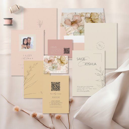 This elegant Save the Date card features a delicate hand-drawn botanical illustration set against an optional soft, rose gold background, creating a calm, sun-washed aesthetic. This design blends modern simplicity with organic beauty, making it ideal for garden, coastal, countryside, and contemporary weddings. The clean layout highlights the couple’s names and wedding date while maintaining an airy, sophisticated feel. Search ID1283 to see other pieces in this coordinated wedding set.