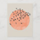 A flock of birds silhouetted in front of a reddish sun on a beige background.
