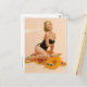Classic PinUp card showing a beautiful girl in black swimsuit at the beach, painted by Al Buell (1910-1996)