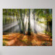 Sunrays in a misty beech forest, golden morning light through the trees on an october day in autumn, Siebengebirge, Rhineland, Germany, Europe. This poster is a gift idea for lovers of the outdoors and natural moods. Photo taken by Katho Menden.