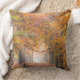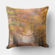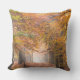 Throw pillow with rays of light created by sunbeams through the fall foliage of the trees along a path through a forest in the morning fog in autumn.