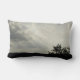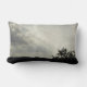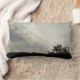 This lumbar pillow features a photo that captures an evening landscape with the sun's rays breaking through the grey and white clouds. The land appears in black silhouette along with the branches of a distant tree. The sunbeams create diagonal lines across the two-tone sky.