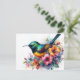 Postcard features watercolor artwork of a green-tailed sunbird. Vibrant, multicolor bird floral portrait art.