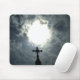 A beautiful scene of a cemetery cross with the sun breaking overhead on a mouse pad.