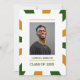 This graduation card announcement features a sunburst background in green, orange and white colors with a room for a vertical photo framed by a white frame.Personalize the card adding your photo, name and year.