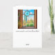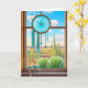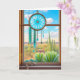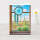 Blank card with pretty suncatcher in the window with a desert scene in the background. Cacti, white fluffy clouds.