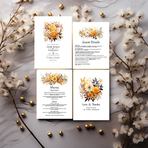 Sundial/powdered gold floral wedding invitation featuring warm beige, a wisp of yellow and spun gold. Ideal for a garden wedding. The QR code on the reverse directs to your wedding site where people can learn more and rsvp.